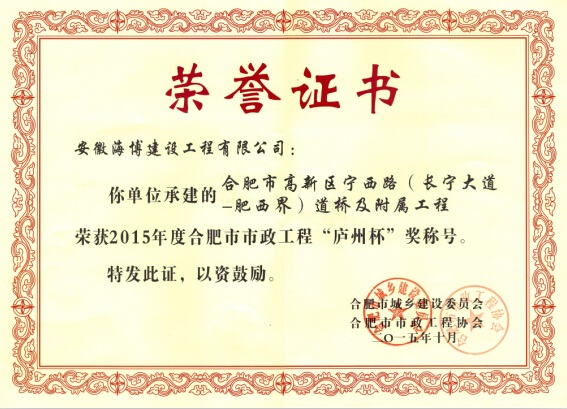 炎炎夏日,骄阳似火,我公司喜获2015年度合肥市市政工程“庐州杯”奖,给酷热的盛夏送来了阵阵凉意。由公司承建的合肥市高新区宁西路(长宁大道-肥西界)道桥及附属工程经合肥市城乡建设委员会及合肥市市...