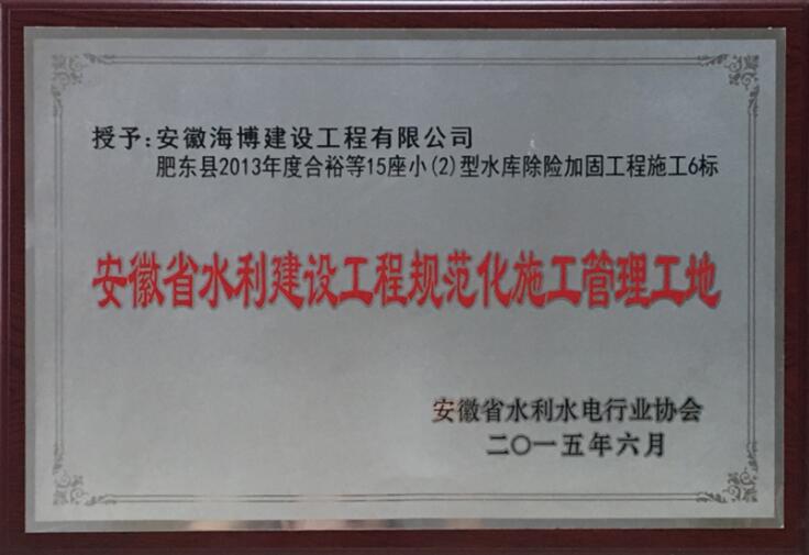 我公司承建的“肥东县2013年度合裕等15座省级?。ǘ┬退獬占庸坦こ?标”获得 2014年度“安徽省水利建设工程规范化管理工地”的荣誉称号。 该工程为省级?。?)型水库除险加固项...