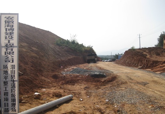 潜山县生活垃圾填埋场场地平整项目位于潜山县黄埔镇黄埔村所属山坳,总占地166亩,设计总库容100万m3,处理垃圾138吨/日。主要工程量为土方挖运8万m3,石方爆破4万m3,土方回填 (含垃圾坝)3.2万m3,场地平整26万m2。