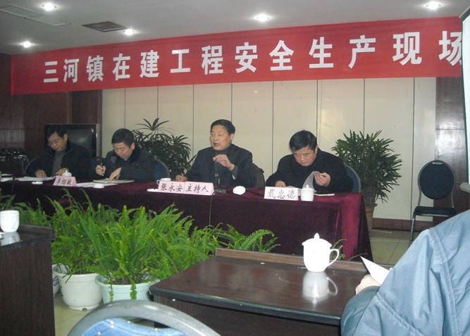 三河镇在建工程安全生产现场会于2009年12月19日09时在三河国际大酒店隆重召开,肥西县建设局党组书记张永安同志参加并主持会议,参加会议的领导还有肥西县建设局局长李绍敏,副局长解军培,副局长戴忠德等。
