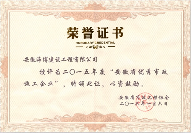 2015年度“安徽省优秀市政施工企业”评选结果于近日揭晓,此次全省共评选出40家优秀市政施工企业,热烈祝贺安徽海博建设工程有限公司位列其中。