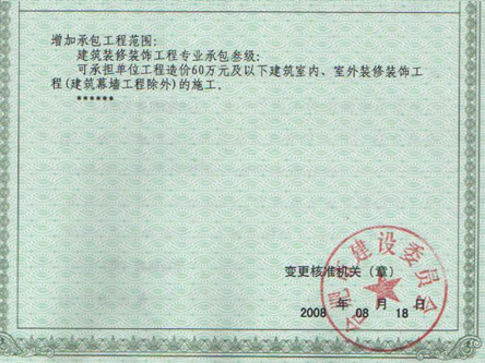 我公司新增装饰装修专业承包三级资质获得批准