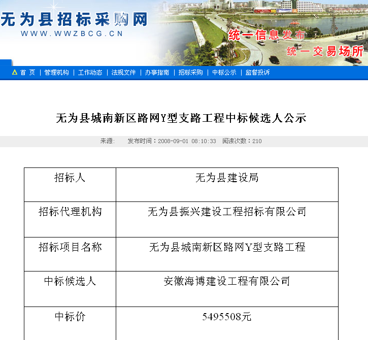 无为县城南新区路网Y型支路中标